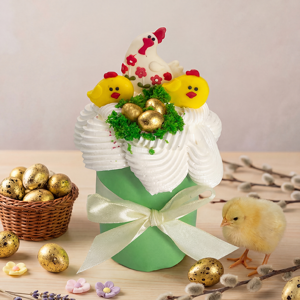 Кекс с начинкой. Украшен белковым кремом, медово-имбирным пряником, орехами в шоколаде и мастикой.Срок хранения: 72 часа в охлажденном виде (4+2) °C