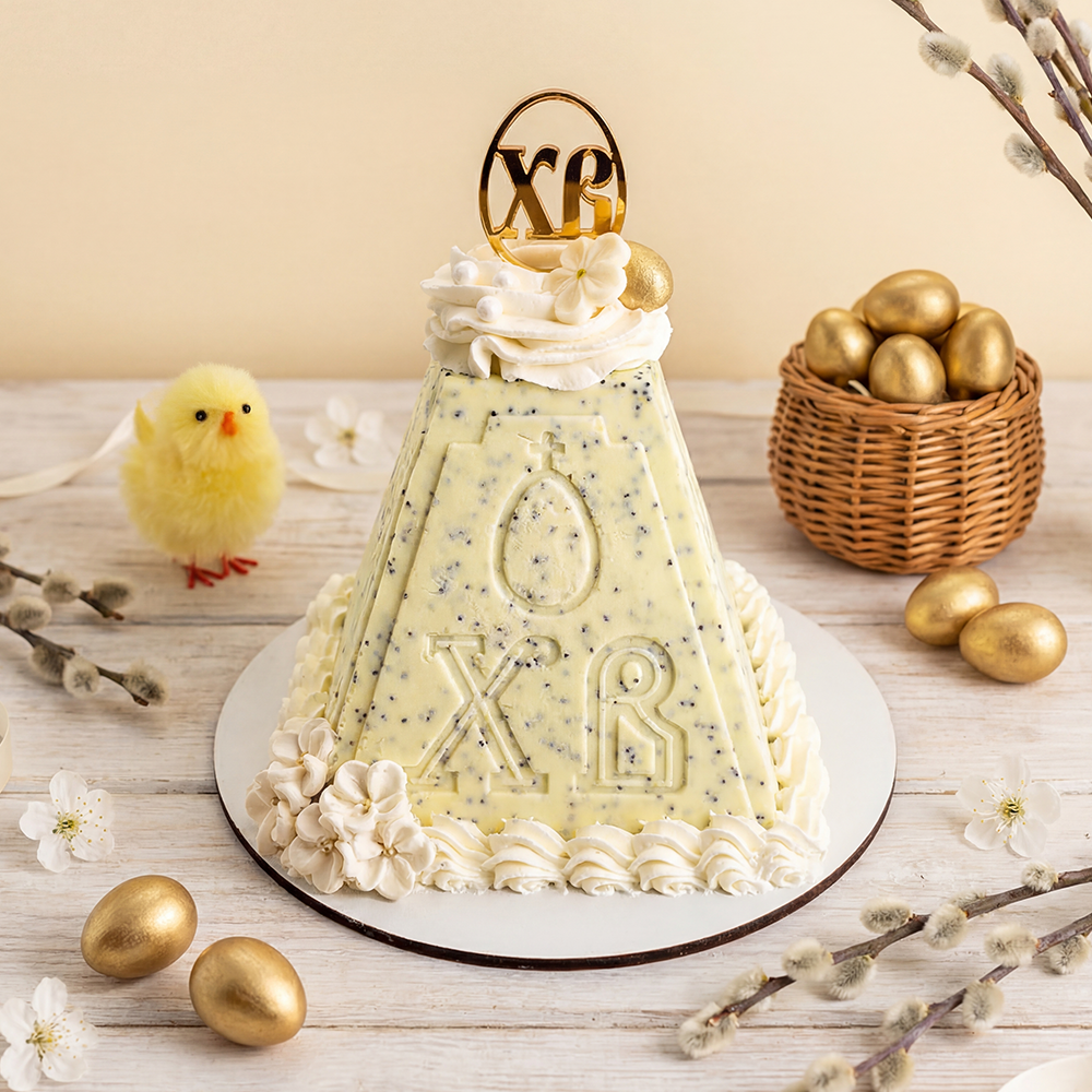 Твороженная пасха мвково-лимонная. Украшена гнездом из крема на основе твороженного сыра и натуральных сливок, арахисом в шоколаде. Топер из оргстекла. Срок хранения: 72 часа в охлажденном виде (4?2) °C Bec: 700г