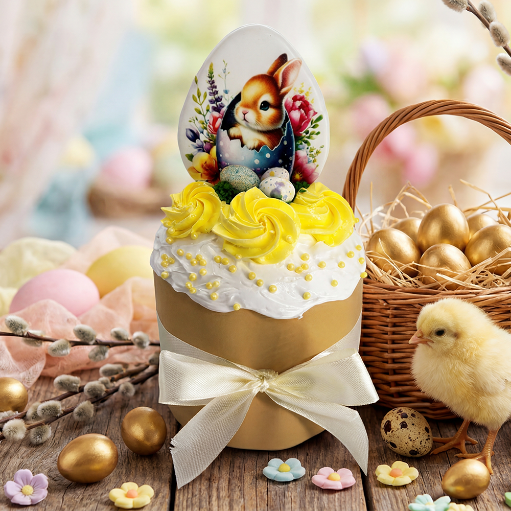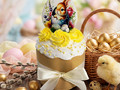 Кулич традиционный (дрожжевой) с сухофруктами. Украшен белковым кремом, медово-имбирным пряником, орехами в шоколаде